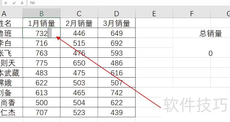 另一种情况是单元格中包含不可见字符,最常见的是空格。所示,虽然数据左上角没有错误提示标志,但求和结果仍为0,原因是数值后存在空格。一旦有空格,Excel会自动将该单元格识别为文本格式,导致无法参与数值计算,因此求和结果为0。