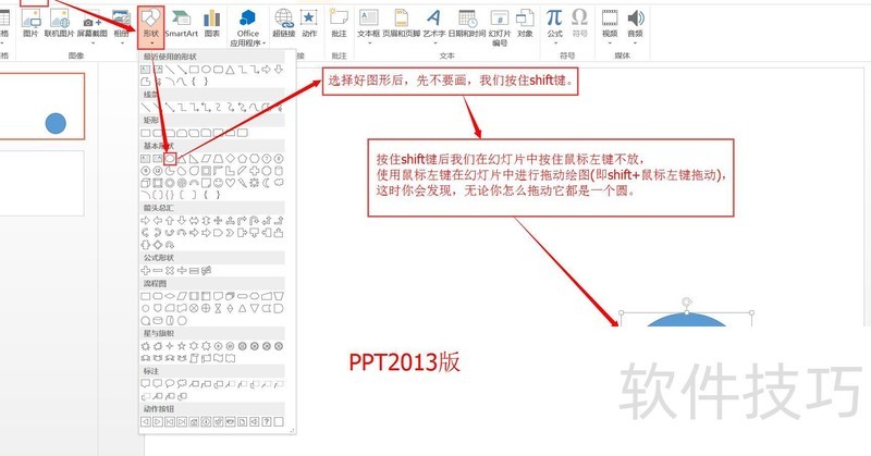 PPT中虽无直接的圆形工具,但可通过1:1比例绘制实现。具体方法是:选中椭圆图形后,按住键盘上的Shift键不放,再进行拖动绘制。此时无论放大或缩小图形,只要保持按住Shift键,所画图形始终为正圆,即纵横直径相等、形状规整。操作简单易行,效果精准。具体步骤可参考下图示意。
