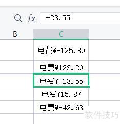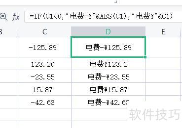此处需借助辅助列,但操作简便,只需输入公式:=IF(C1<0,电费-?&ABS(C1),电费?&C1),即可自动显示正负金额。