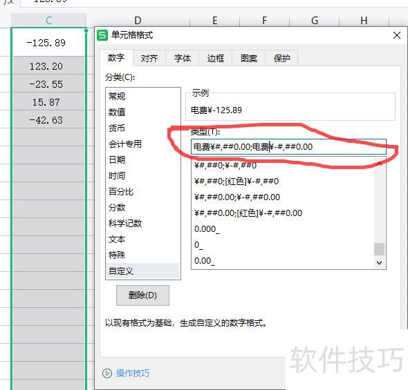 A1单元格将显示电费-?125.89,符合你的需求。