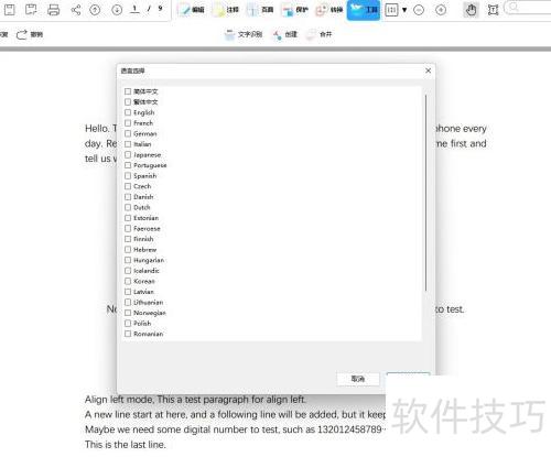 打开文件后,点击顶部菜单栏的工具,再选择子菜单中的文本识别,系统将弹出语言选择对话框,提供29种语言选项。选定所需语言后,点击右下角确定按钮,即可开始文本识别。