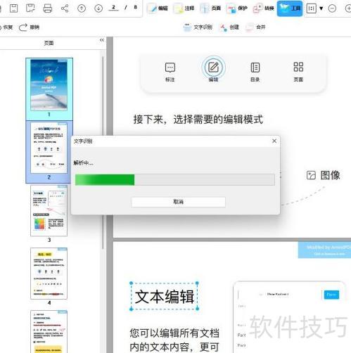 文本识别速度可能因文件大小而异,请稍候片刻,识别完成后可编辑的PDF将自动打开,可直接使用金闪PDF编辑器进行修改。