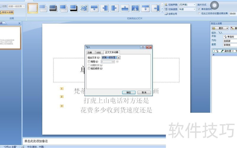 还可插入文本框输入多段文字,并设置单击一次显示一段的动画效果。操作步骤:在文本框中录入多段内容,选中文本框边框,进入动画选项卡,点击自定义动画,添加进入效果中的擦除,开始方式设为单击时,方向选择自左侧。接着右击该动画项下拉箭头,打开计时设置,将组合文本设为按第一级段落,最后确认即可实现逐段显示。