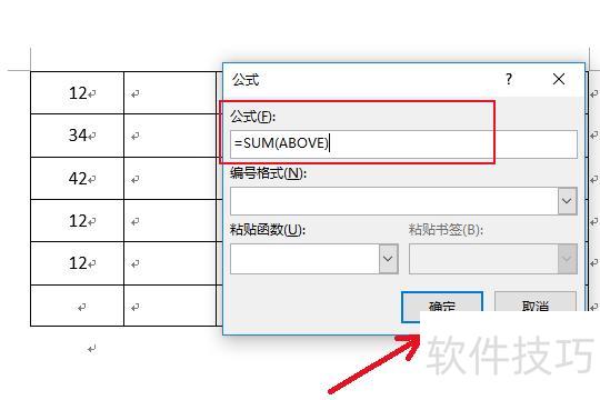 在弹出窗口中输入公式SUM(ABOVE),点击下方确定按钮即可。