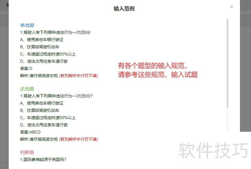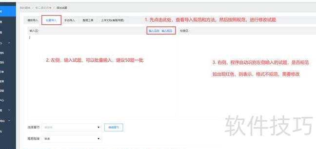 第三步:将试题复制到输入框,待右侧无红色提示后,点击页面底部蓝色添加试题按钮,导入成功后系统会提示成功导入xx道试题。