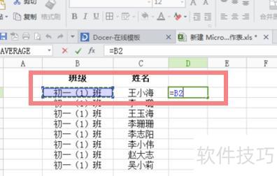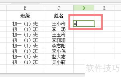 输入等号后,用鼠标点击班级列的第一个单元格,空白单元格中便会显示=B2。