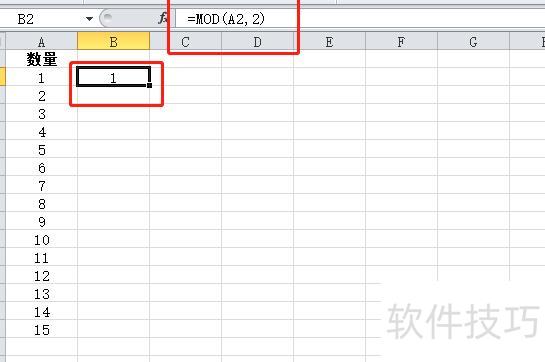 所示,若要在A列中筛选奇数或偶数,可先在B2单元格输入公式=MOD(A2,2)。该公式使用MOD函数计算A2除以2的余数,若余数为0,表示A2为偶数;若为1,则为奇数。按下回车键即可得出判断结果。