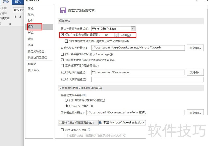 以Word 2016为例,点击文件选项卡,打开Word选项对话框,选择保存类别,在保存文档区域的保存自动恢复信息时间间隔微调框中设置所需时间,默认值为10分钟。