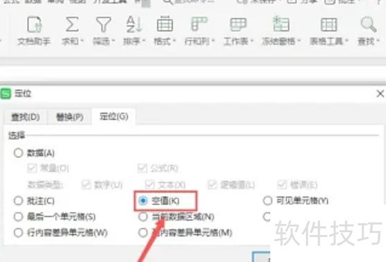 在定位设置中选择定位条件,勾选空值后确认即可。