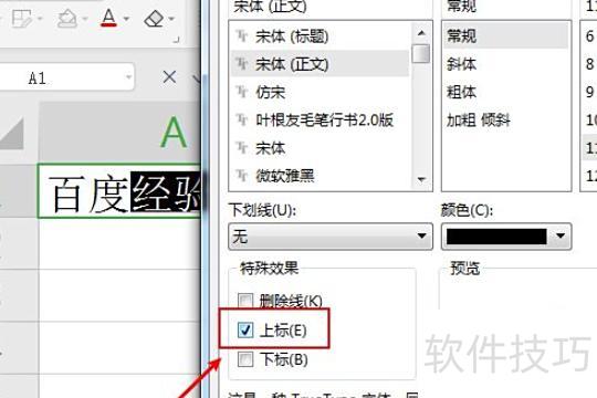 在字体设置中选择上标选项,操作所示。