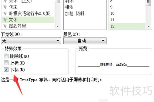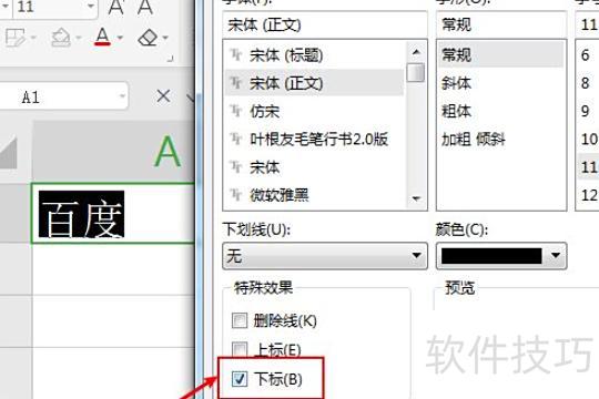 在字体设置中选择下标选项,所示。