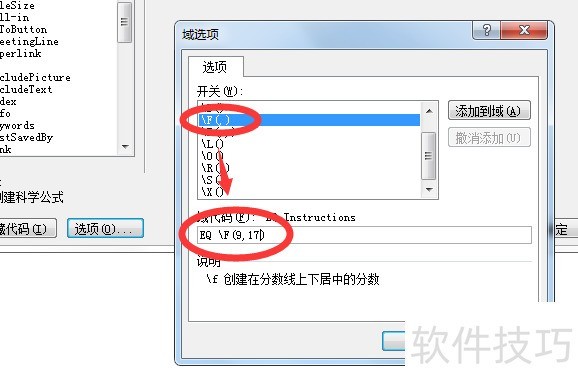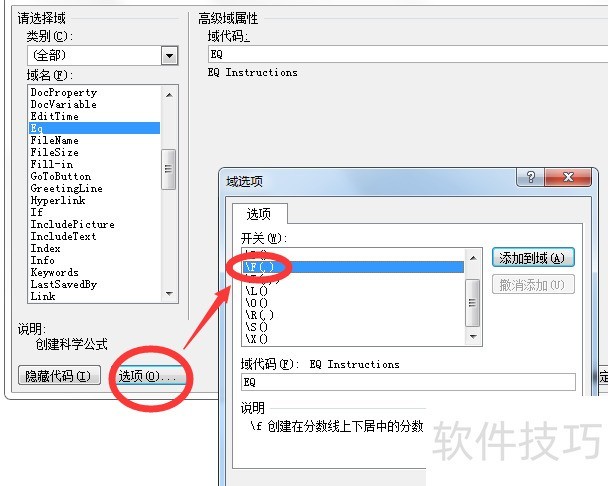 第三步:点击下方选项按钮,在弹出的域选项对话框中找到F(,)开关。