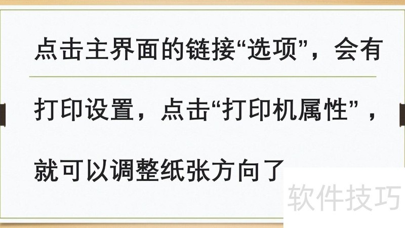 点击主界面选项链接,进入打印设置,再点打印机属性即可调整纸张方向。
