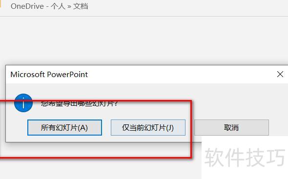 此时将弹出窗口,提示选择要导出的幻灯片,可选全部或仅当前幻灯片。