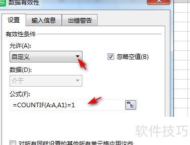 在弹出的对话框中,允许条件选择自定义,公式栏输入:=COUNTIF(A:A,A1)=1。
