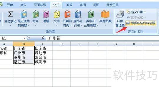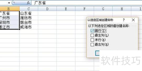 首先整理数据,第一列为一级下拉选项,其余各列分别为对应的一级选项的二级内容,每个一级选项对应一列二级数据,且每列首单元格必须为对应的一级选项名称。选中第一列二级数据后,点击公式栏中的名称管理器右侧的根据所选内容创建按钮,生成名称。