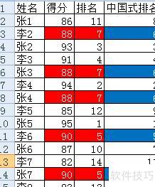 在EXCEL中,默认排名方式为:相同成绩并列,后续名次按实际顺序递减,如第5名两人并列,则无第6名,直接跳至第7名。