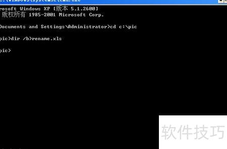 在DOS模式下,先输入命令cd c:pic并回车,进入指定目录;再输入dir /b>rename.xls并回车,即可将该文件夹内所有文件名导出并保存到rename.xls文件中,所示。