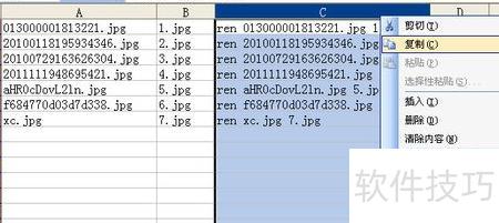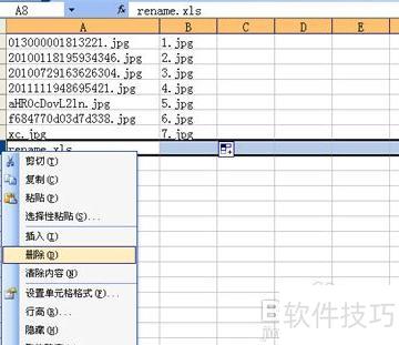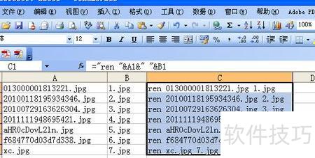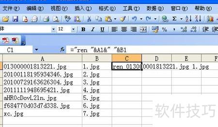 接着用Excel打开C盘pic文件夹中的rename.xls文件,A列会列出所有文件名(可手动调整顺序),在B1单元格中输入1.jpg,作为第一个文件的新名称。