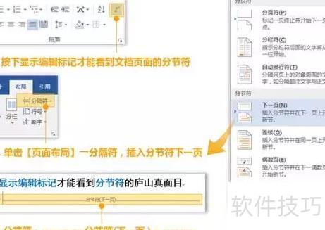 在-中可找到分节符,需先点击段落功能区的,才能查看分节符(下一页)的实际显示效果。