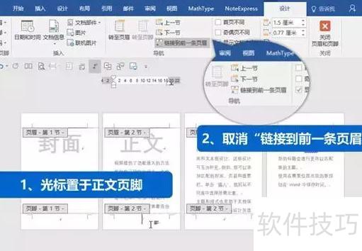 将光标移至第二节正文处,双击页脚区域,点击页眉页脚工具栏中的链接到前一条页眉按钮,取消与前一节的关联,从而实现两节页脚独立设置。