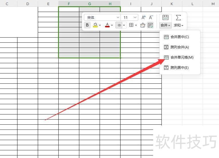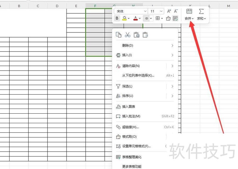 在下拉菜单中选择合并单元格即可完成操作。