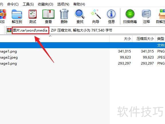可采用另一种批量导出图片的方法:将Word文档的后缀名由.docx改为.rar,随后以压缩包形式打开该文件。在压缩包内进入word/media文件夹,其中存放着文档中的所有图片。通过查看图片属性,可获取其格式、尺寸和大小等信息。此方法仅适用于Office 2007及以上版本的docx格式文件;若为早期的doc格式,需先另存为docx格式方可操作。直接解压或框选图片拖出即可完成批量导出,操作简便高效。