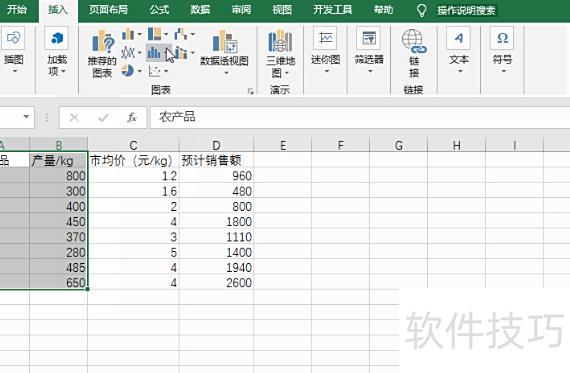 选中表格中的农产品和产量两列数据,进入插入界面,点击柱形图图标,选择二维柱形图。在生成的图表上右键单击,选择添加数据标签,并在弹出的窗口中完成数据标注。根据实际需求,也可选用其他样式的柱形图以满足展示效果。