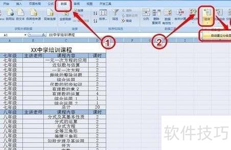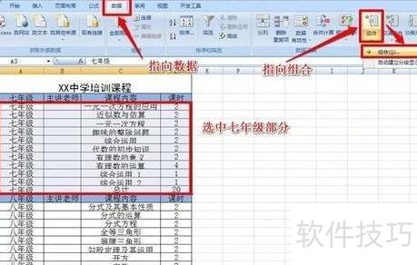 选中七年级部分,依次点击数据→组合→组合进行操作。