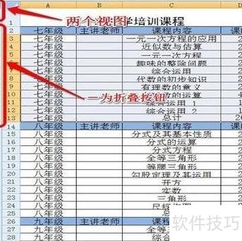 此时表格左侧会显示1、2两个视图。点击1可折叠七年级内容,点击2则展开全部信息。此外,七年级内容左侧还设有折叠按钮,同样可实现收起操作,方便查看与管理。