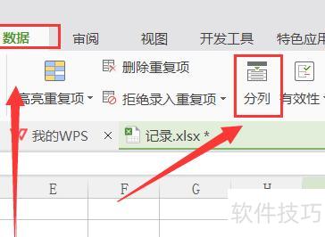 接着点击菜单栏的数据选项卡,进入后在数据工具组中找到并选择分列功能。