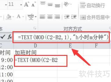 按照上述步骤,在加班时间列对应的单元格中输入公式=TEXT(MOD(C2-B2,1),h小时m分钟),所示,按下回车键后,D2单元格将显示计算结果。