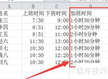 上班时间计算:将打卡时间转为24小时制,减去8小时(上午工作时长),再加9小时(含加班时间)。