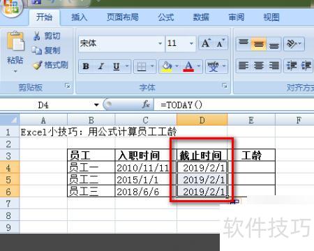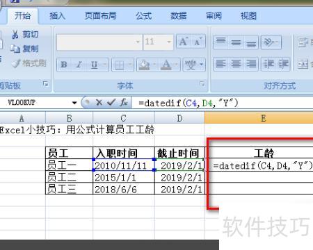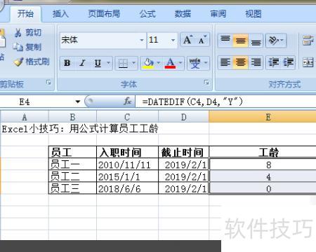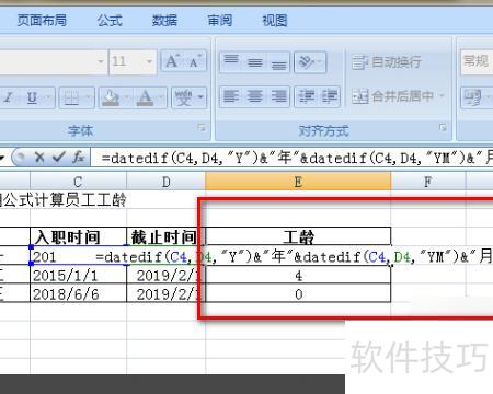 在E4单元格输入=DATEDIF(C4,D4,Y),用于计算从入职时间至截止时间的工龄。