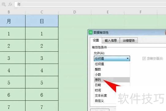 在序列设置菜单左侧的序列产生栏中,用鼠标选择列,然后在类型中点击日期,并从日期单位中选择日。