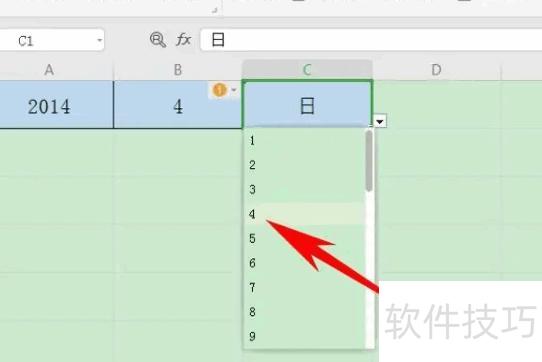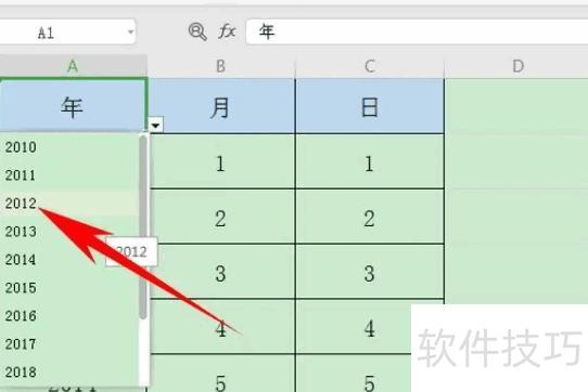对B列月份和C列日期执行相同操作,年份标题右下角会出现倒三角,点击可展开下拉菜单,选择所需日期。