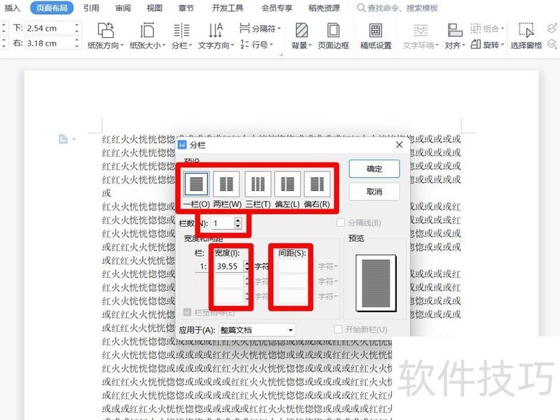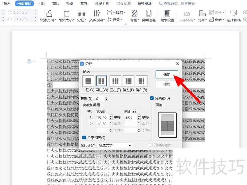 在分栏页面设定栏数、宽度与间距,确认后即可完成分栏。