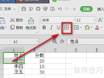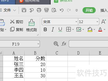 在打开的文档中,于A1单元格输入姓名,A2填入张三,A3填入李四,A4填入王五;在B1单元格输入分数,B2输入20,B3输入10,B4输入30。