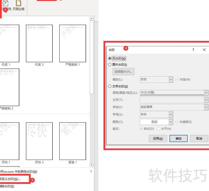 进入设计选项卡,点击水印,选择自定义水印进行设置。
