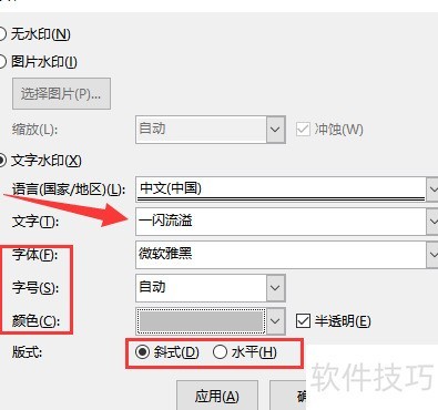 点击文字水印,在箭头指示处输入所需文字,随后可调整字体、字号、颜色及排版样式。设置完成后点击应用预览水印效果,根据实际显示情况进一步修改,满意后点击确定保存设置。