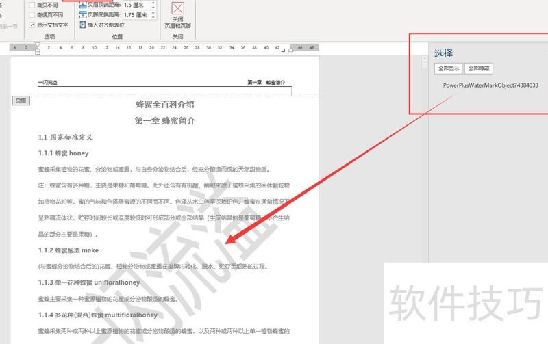 双击页眉区域,进入后点击开始选项卡中的选择按钮,再打开选择窗格,或直接使用快捷键Alt+F10。