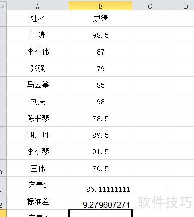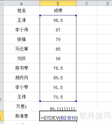在B11单元格中输入=VAR(B2:B10)计算方差。