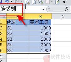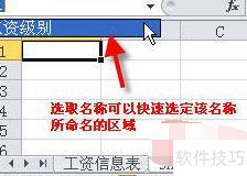 定义名称后,该名称会显示在地址栏中。此后,在当前工作簿的任意工作表内,只需在地址栏选择工资级别,即可立即跳转至对应工作表并自动选中该名称所指定的区域。