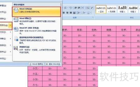 单击后将打开所示的工作表,此时点击左上角的Microsoft Office图标,将鼠标悬停在另存为选项上,从下拉菜单中选择Word文档即可完成操作。