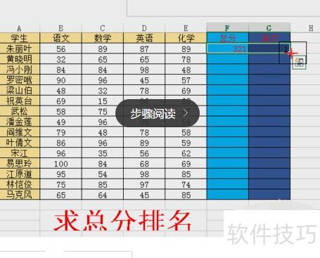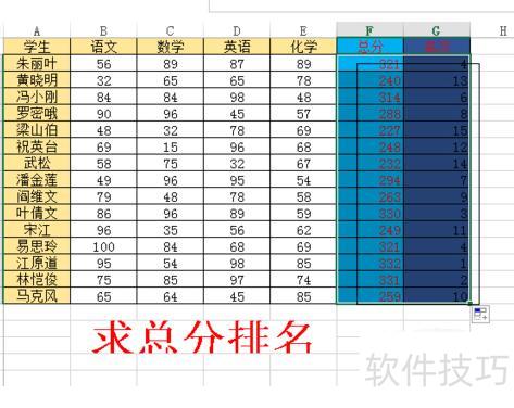 第四步:选中F2和G2单元格,将鼠标移至G2右下角,待光标变为+后,按住左键向下拖动至最后一行数据,即可自动生成总分和排名。