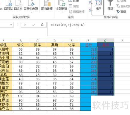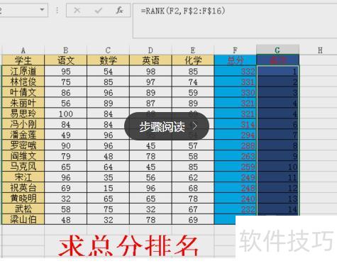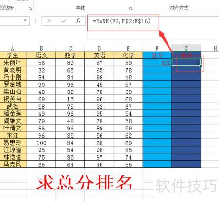 第三步:进行排名计算,使用RANK函数。在G2单元格输入公式 =RANK(F2,F$2:F$16),此时显示的第一名可能有误,无需担心,请继续后续步骤。