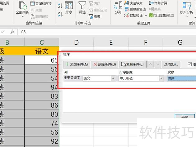 弹出条件窗口,选择成绩列,点击排序方式,选降序即可。