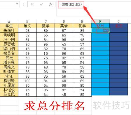 第二步:在F2单元格输入公式=SUM(B2:E2),计算学生总分。