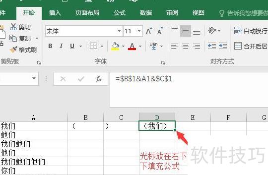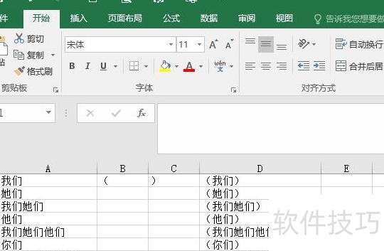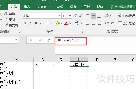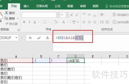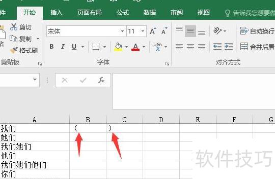 在B1和C1单元格中分别输入左括号和右括号作为辅助标识。