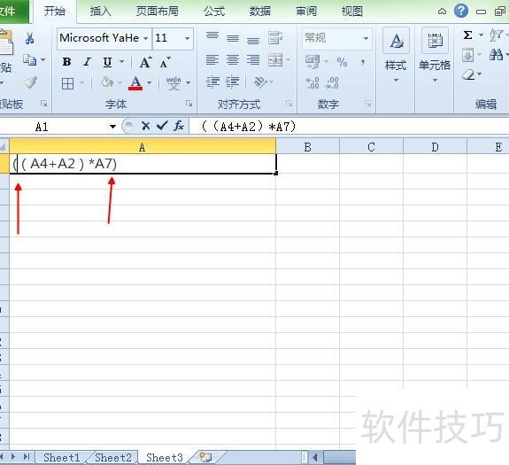 第二步:在(A4+A2)后输入*A7,并用一对括号将其整体括起,公式变为((A4+A2)*A7),表示先求A4与A2的和,再将结果乘以A7。所示: